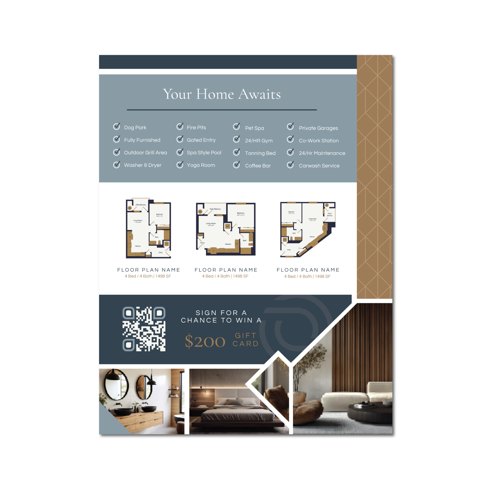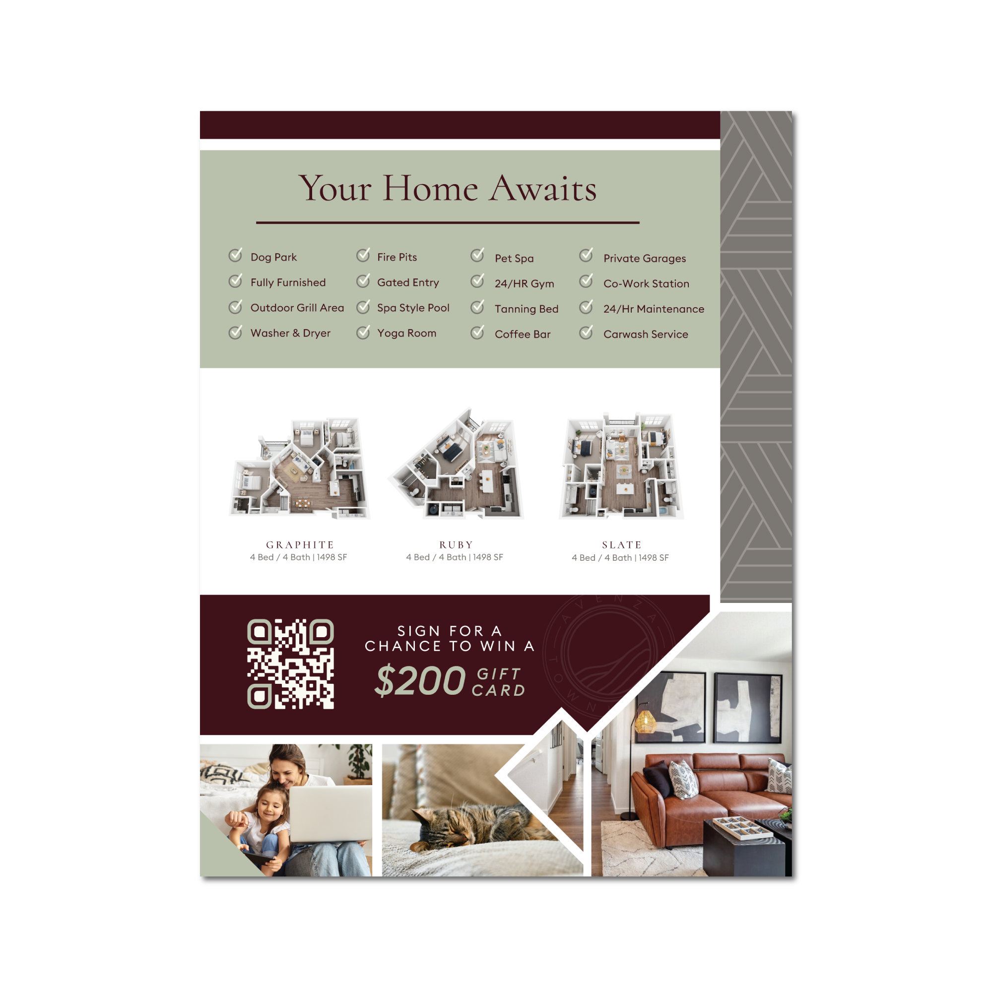 Use/Application: Flyer door to door, hand to someone after a tour along with a brochure, keep on the front desk for residents to see and take with them